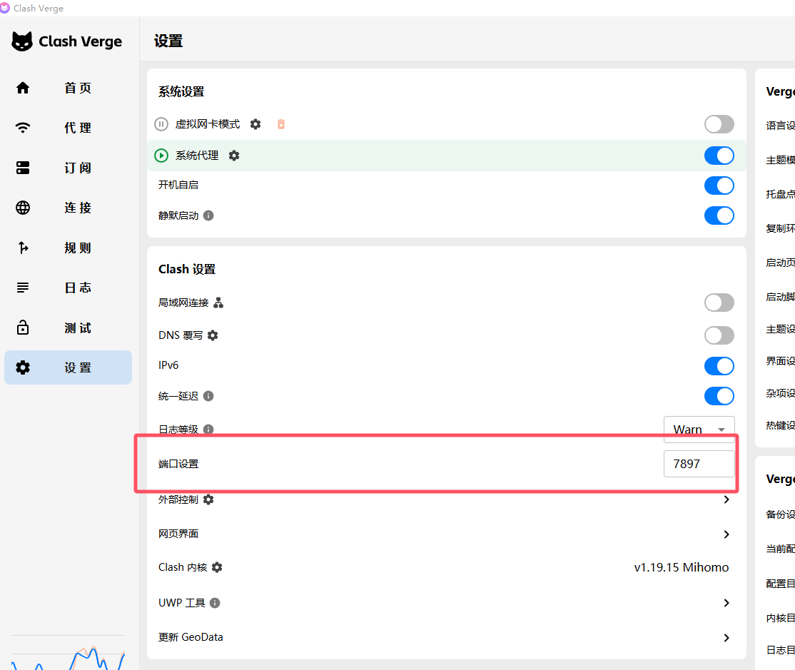 git config --global --list | grep proxy当我们本地挂上代理工具,如Clash Verge时,倘若我们启用了代理,会有一个本地代理端口号,如下图所示。